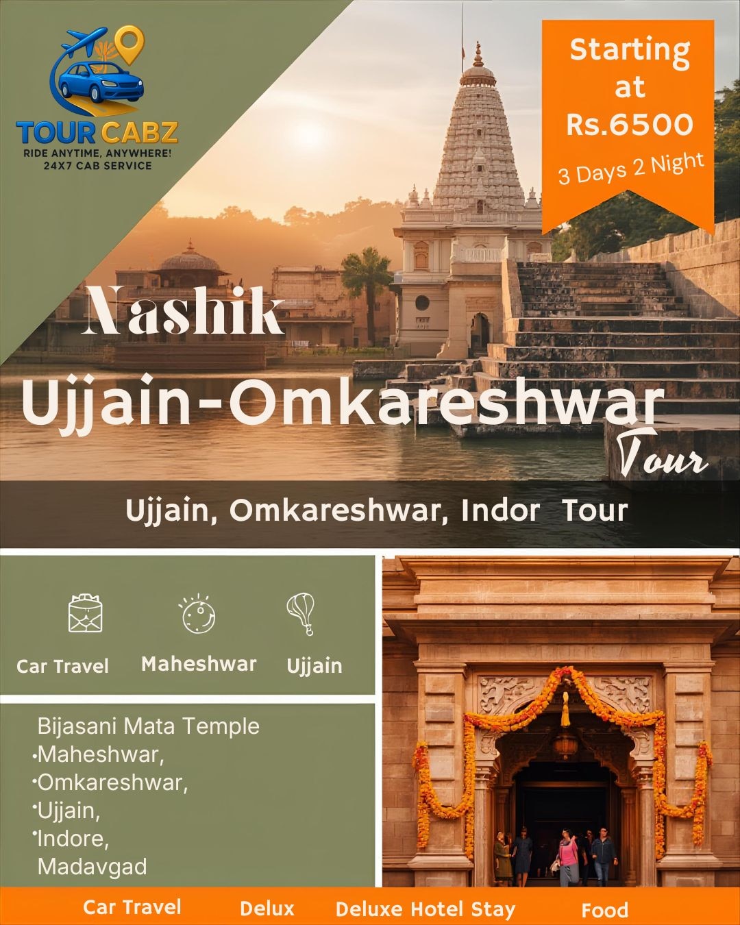 Discover the spiritual essence of Madhya Pradesh with TourCabz’s Nashik to Ujjain Omkareshwar Tour Package (3 Days / 2 Nights). Starting at just ₹6500, this exclusive travel package is designed for devotees and explorers who wish to experience divine destinations with comfort and convenience. The journey covers some of the most sacred and scenic places including Bijasani Mata Mandir, Maheshwar, Omkareshwar, Ujjain, Indore, and Madavgad. TourCabz ensures a seamless travel experience with a private car for the entire trip, deluxe hotel accommodation, and delicious meals included in the package. From the holy ghats of Ujjain to the serene banks of the Narmada River in Omkareshwar, every moment of this journey is filled with devotion, culture, and beauty. The Nashik to Ujjain Omkareshwar tour is perfect for families, groups, and solo travelers seeking a peaceful getaway that blends spirituality with comfort. Our professional drivers, clean vehicles, and well-planned itinerary make your pilgrimage stress-free and memorable. Highlights of the Tour: Duration: 3 Days / 2 Nights Starting Price: ₹6500 per person Destinations Covered: Bijasani Mata Mandir, Maheshwar, Omkareshwar, Ujjain, Indore, Madavgad Inclusions: Car for travel, deluxe hotel stay, and food Departure: From Nashik Experience the divine energy of Omkareshwar Jyotirlinga, the spiritual aura of Mahakaleshwar Temple in Ujjain, and the cultural charm of Maheshwar Fort. TourCabz ensures every traveler enjoys a comfortable and safe journey with personalized service and transparent pricing. Book your Nashik to Ujjain Omkareshwar tour package today and embark on a soulful journey through the heart of India. For bookings and inquiries, visit www.tourcabz.com or call 08048073953. TourCabz – Your trusted travel partner for spiritual tours, comfortable rides, and unforgettable experiences.